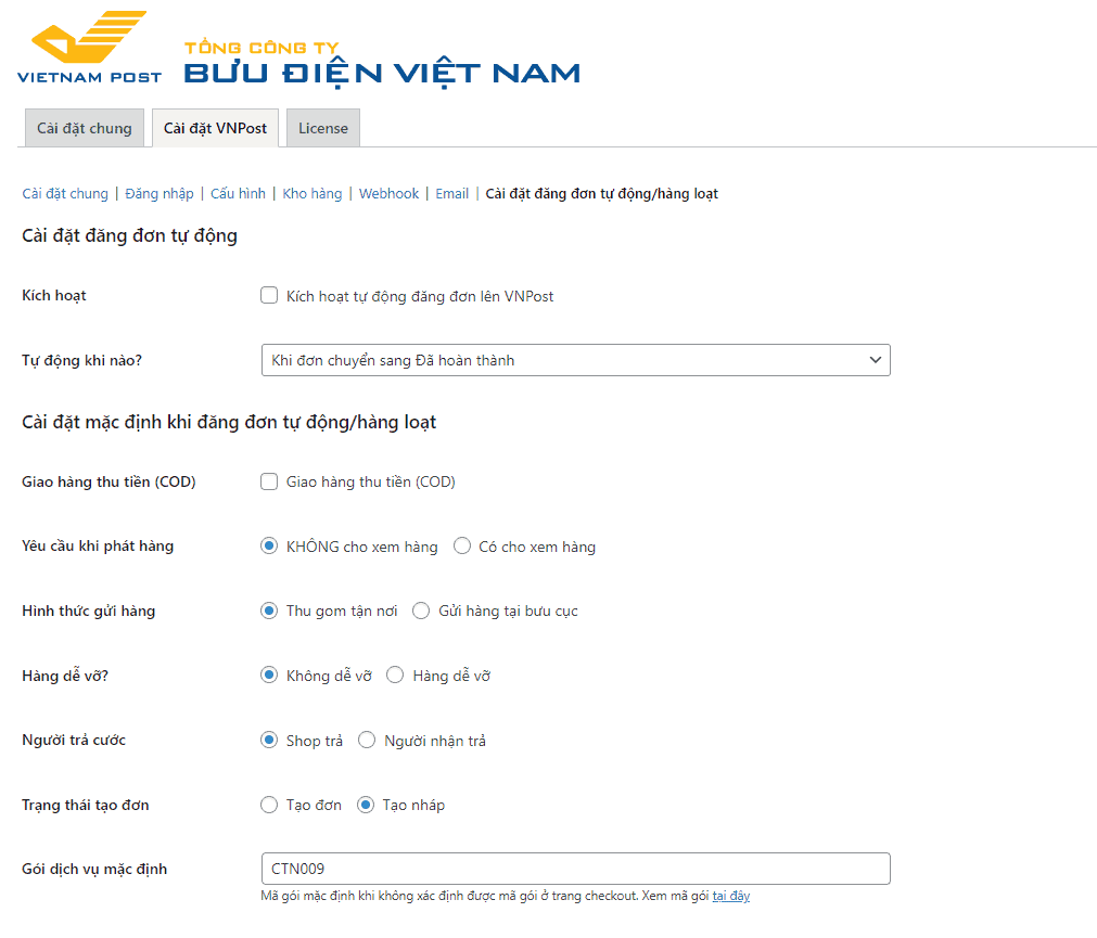 Trong hình là cấu hình mặc định các giá trị cho các đơn khi đăng tự động lên VNPost
