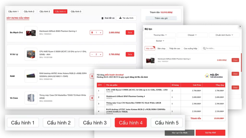 Hiển thị đầy đủ thông tin giá cả và các sản phẩm đã chọn để xây dựng cấu hình.