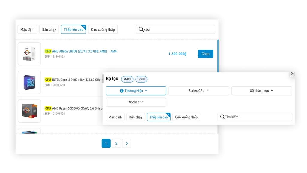 Popup chọn sản phẩm, lọc và sắp xếp sản phẩm