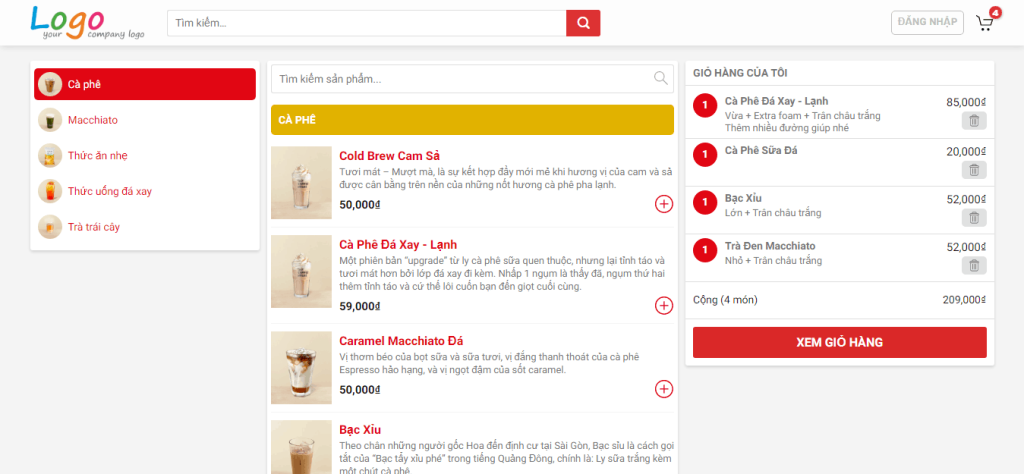 Với sản phẩm có option, topping thì khi thêm vào giỏ sẽ hiện popup để khách có thể lựa chọn option, topping phù hợp và tính giá ngay khi khách chọn