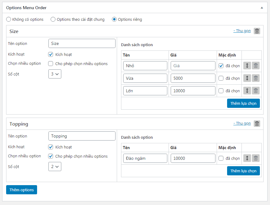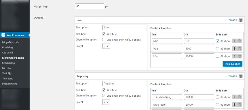 Plugin đặt đồ ăn nhanh, đồ uống online cho WordPress và Woocommerce. Thêm món ăn, đồ uống và option không giới hạn. Bạn có thể thêm mọi option bạn muốn.