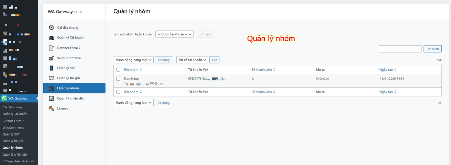 • QUẢN LÝ: Quản lý danh sách số điện thoại và nhóm WhatsApp