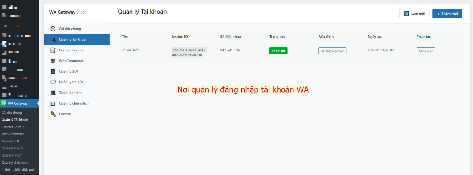 đây là nơi đăng nhập và đăng xuất các tài khoản WA. Có thể 1 hoặc nhiều tài khoản