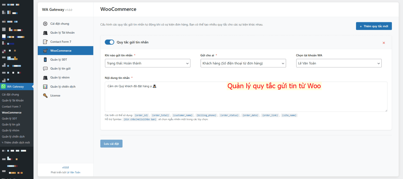 ✅ WOO: Tùy biến nội dung tin nhắn với đầy đủ thông tin đơn hàng (mã đơn, tên khách, sản phẩm, tổng tiền…)