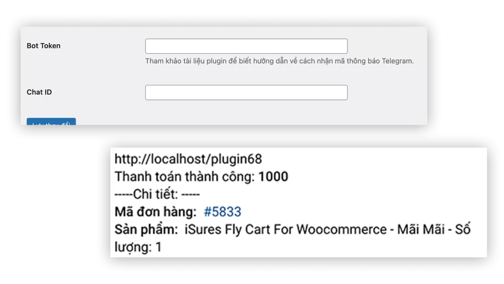 Ngay sau đó chi tiết đơn hàng được hoàn tất khi thanh toán qua ACB Gateway sẽ được báo qua Telegram. Xem chi tiết cách cài đặt Bot Telegram tại tài liệu của plugin.