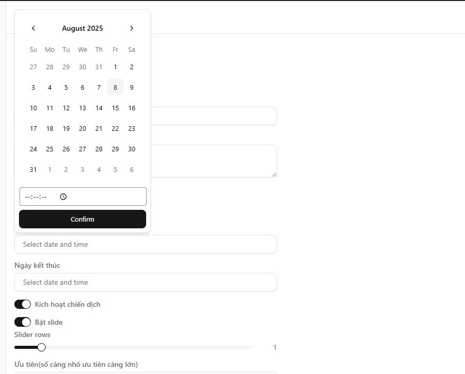 • Đặt số thứ tự ưu tiên cho mỗi chiến dịch. Điều này giúp xác định mức giá Flash Sale sẽ được áp dụng khi một sản phẩm thuộc nhiều chiến dịch — chiến dịch có mức ưu tiên thấp hơn sẽ được ưu tiên áp dụng.