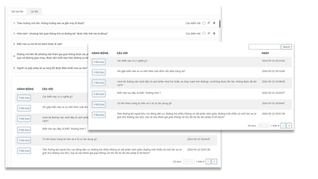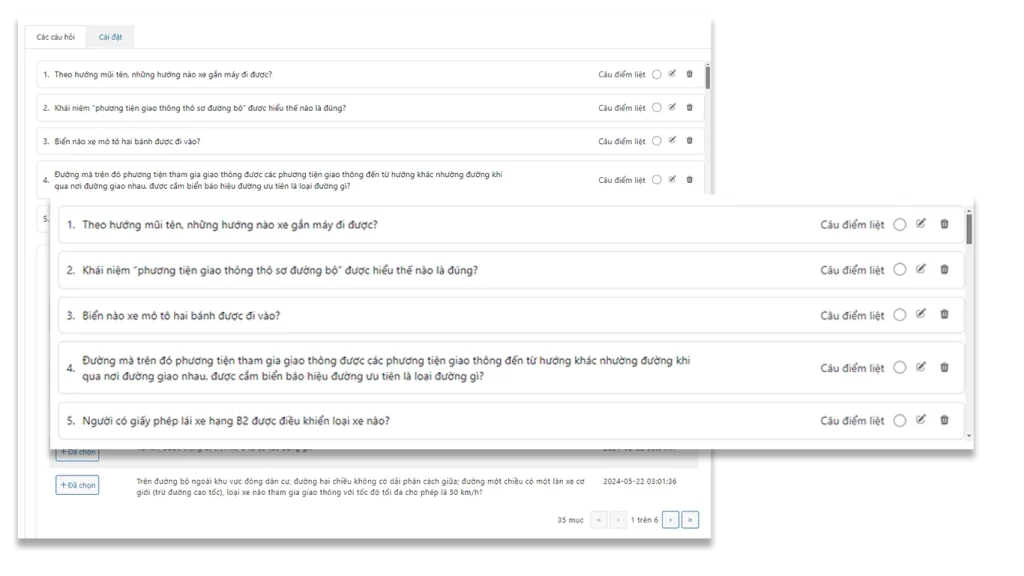 Sau khi thêm câu hỏi, có thể thay đổi vị trí hoặc xóa hay chỉnh sửa câu hỏi. Và set được câu điểm liệt.