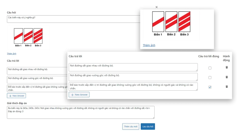 Dễ dàng thêm các câu hỏi, đáp án cho câu hỏi, kèm hình ảnh minh họa, và giải thích đáp án