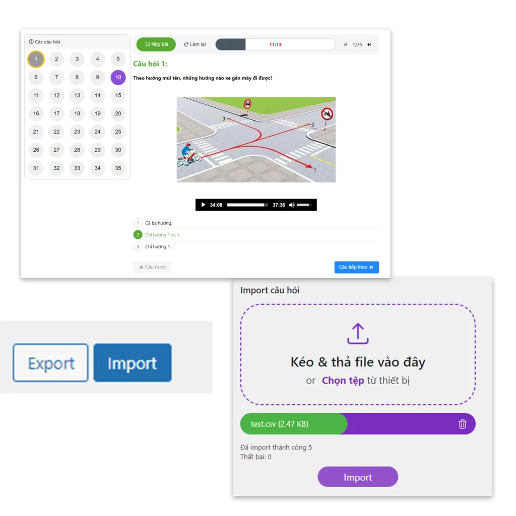 • Có công cụ export, import bộ câu hỏi file excel.