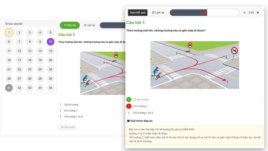 Sau khi nộp bài, người dùng có thể xem được giải thích đáp án, và lựa chọn đúng sai của từng câu hỏi