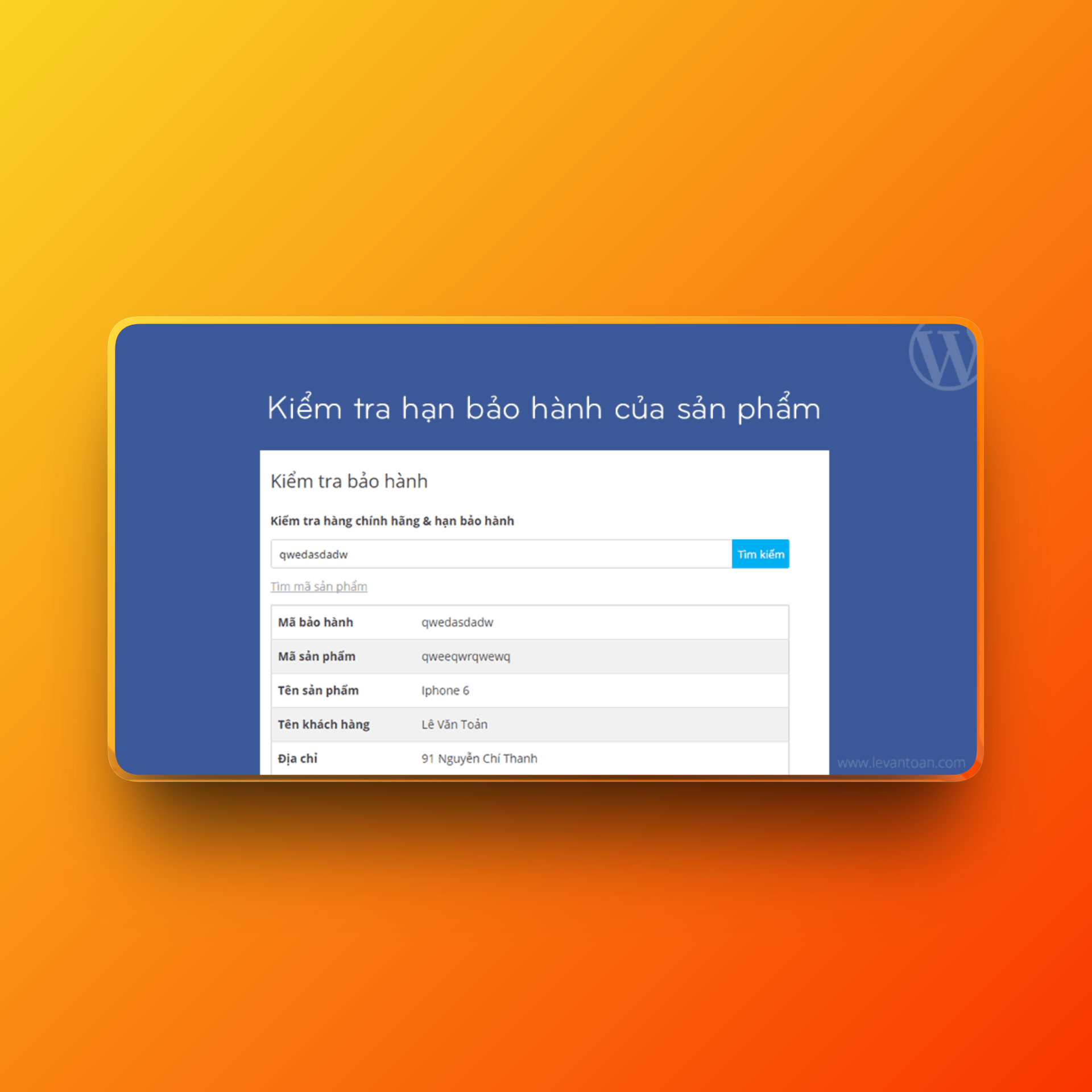 Plugin này giúp công ty hay cửa hàng của bạn quản lý được thông tin về hạn bảo hành của sản phẩm và thông tin khách hàng mua sản phẩm và nhân viên bán hàng. Thuận tiện để khách hàng tra cứu thời gian bảo hành của sản phẩm