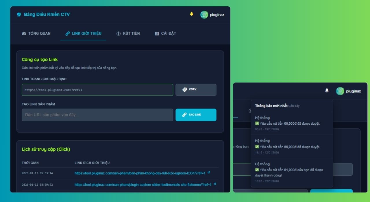 Với khả năng tự động tính hoa hồng, thống kê minh bạch, dashboard CTV hiện đại và thông báo tức thì, AZ AFF giúp bạn xây dựng hệ thống tiếp thị liên kết hiệu quả, minh bạch và dễ mở rộng cho website WordPress bán hàng.