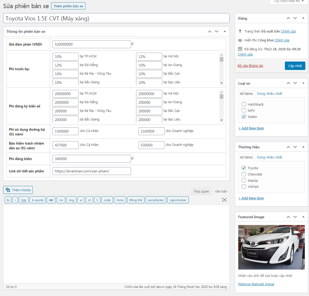 Giao diện thêm mẫu xe trong admin. Các thông số như phí trước bạ và đăng ký biển số sẽ tùy biến theo vùng miền đăng ký.