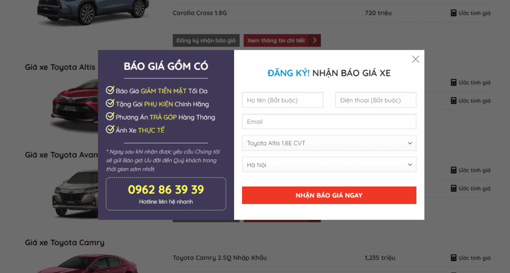 Sử dụng form Cf7 để gửi đăng ký nhận báo giá. kèm theo thông tin xe mà khách chọn trước đó