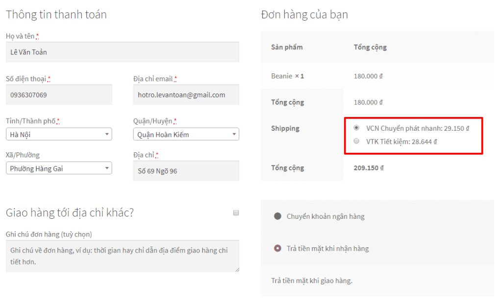 Phí vận chuyển dựa theo phương thức thanh toán. Nếu chọn Trả tiền khi nhận hàng (COD) thì có mức phí đắt hơn so với Chuyển khoản ngân hàng do không cần chịu phí COD. Cài này sẽ có lời cho khách hàng và đánh vào tậm lý của khách được giá vận chuyển rẻ hơn khi thanh toán trực tuyến.
