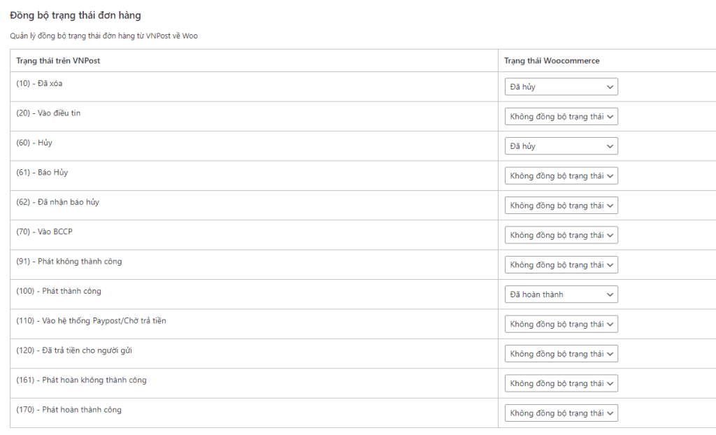 Phần cài đặt này giúp bạn đồng bộ trạng thái từ VNPost với Woocommerce qua Webhook.
