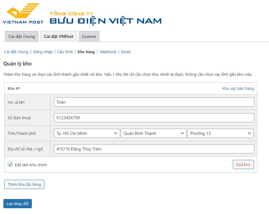 Thêm sửa xoá các kho hàng và chọn khu vực bán hàng của kho đó. Chú ý hãy chọn 1 kho nào đó làm kho chính để trong trường hợp không có kho nào tương thích thì sẽ lấy kho chính để tính
