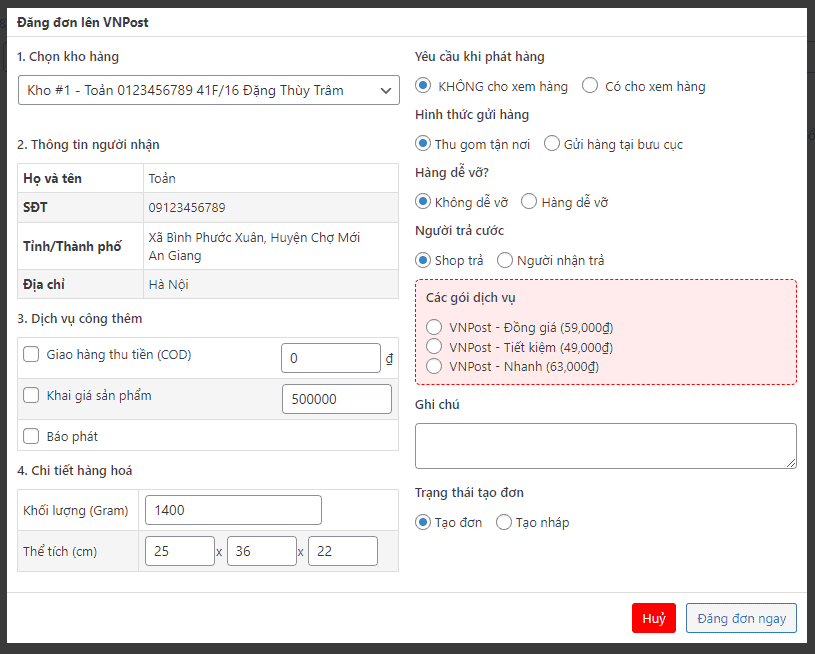 Giao diện trực quan, đơn giản và đầy đủ thông tin. Chỉ cần ấn Đăng đơn ngay là mọi thông tin đơn hàng của bạn sẽ lên hệ thống VNPost.
