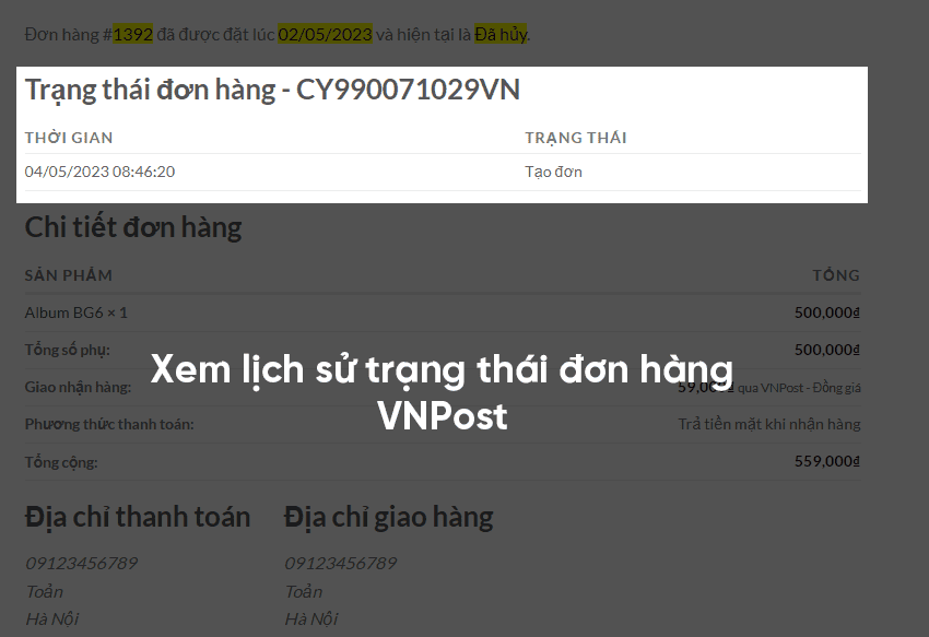 Khách có thể vào trang tài khoản > Đơn hàng > Xem chi tiết đơn hàng để xem lịch sử trạng thái đơn hàng trên VNPost