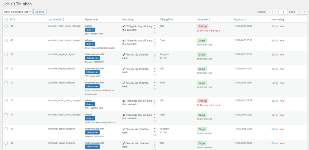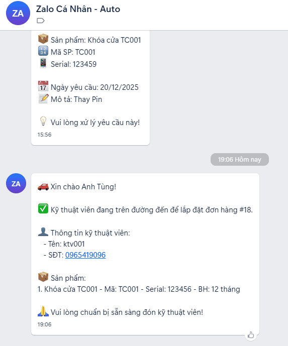 Thông báo cho nhân viên hoặc khách hàng thông qua zalo thông qua Zalo cá nhân khi tạo đơn, thay đổi trạng thái đơn, bảo hành.
