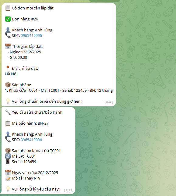 Thông báo cho nhân viên hoặc khách hàng thông qua tele khi tạo đơn, thay đổi trạng thái đơn, bảo hành.