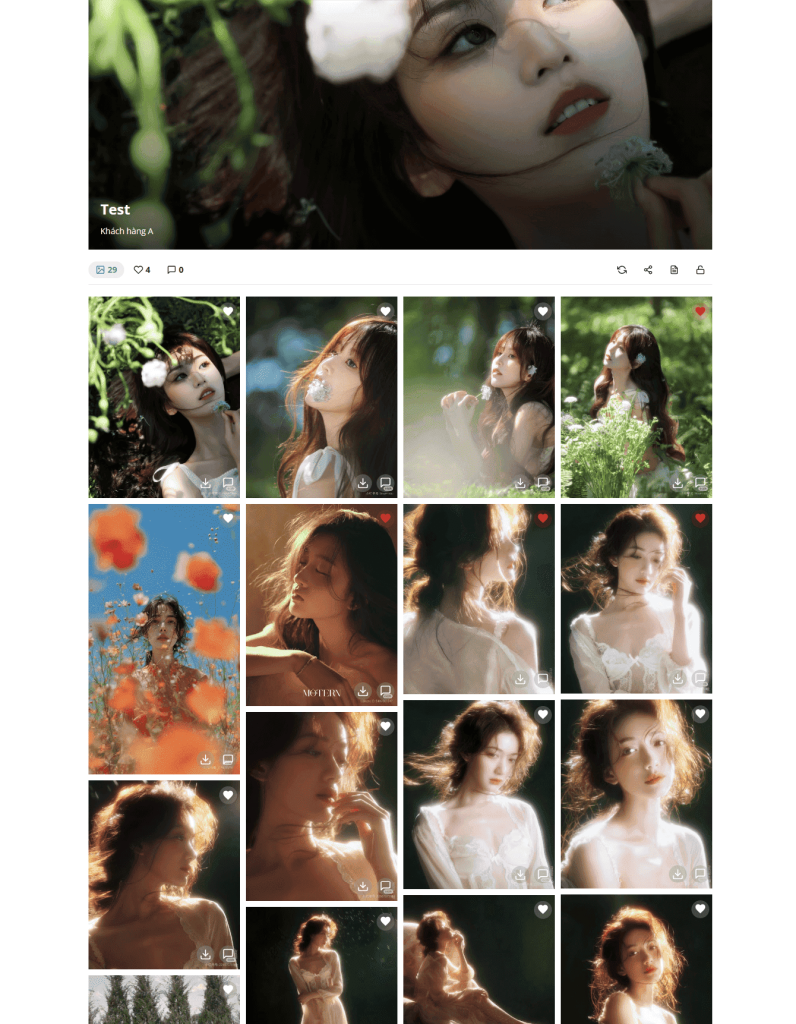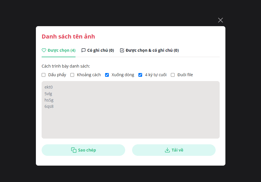 – Tải xuống file .txt/.xlsx tên các file ảnh mà khách đã chọn kèm theo ghi chú của khách