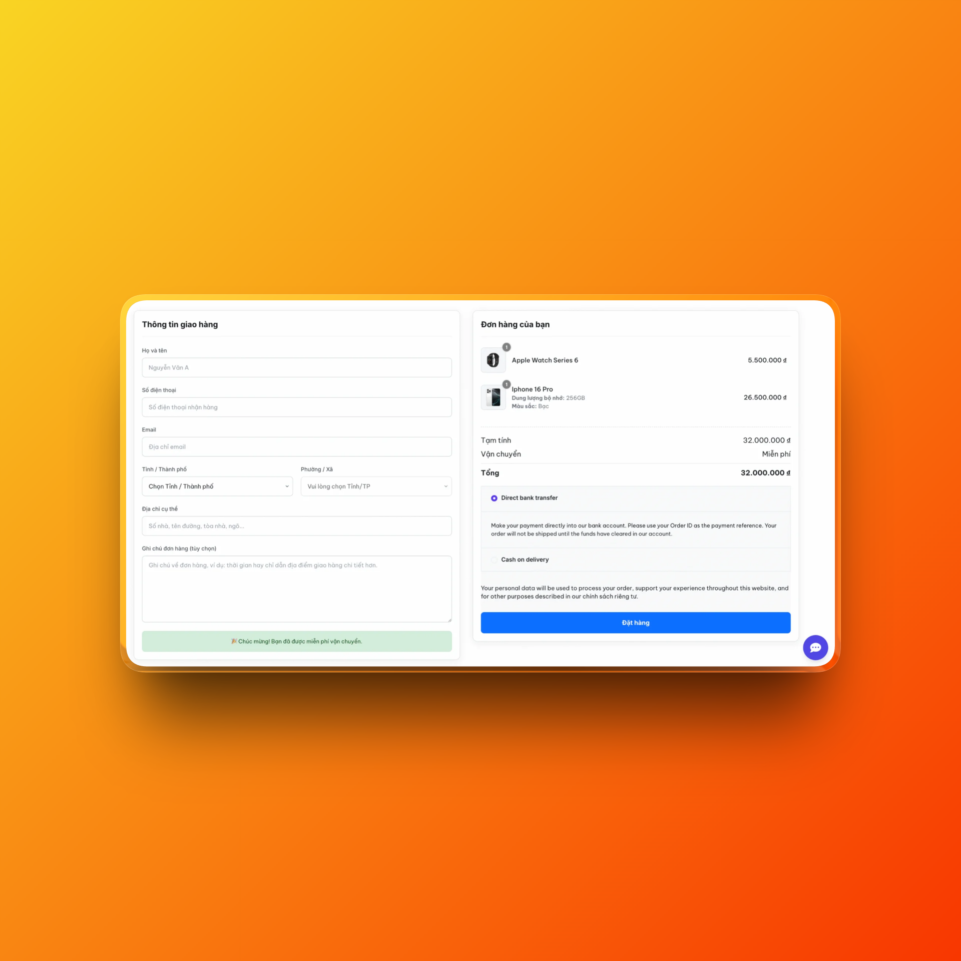 Đây là nơi khách hàng nhập các thông tin cần thiết để nhận sản phẩm. Các trường thông tin được sắp xếp một cách logic và quen thuộc:
