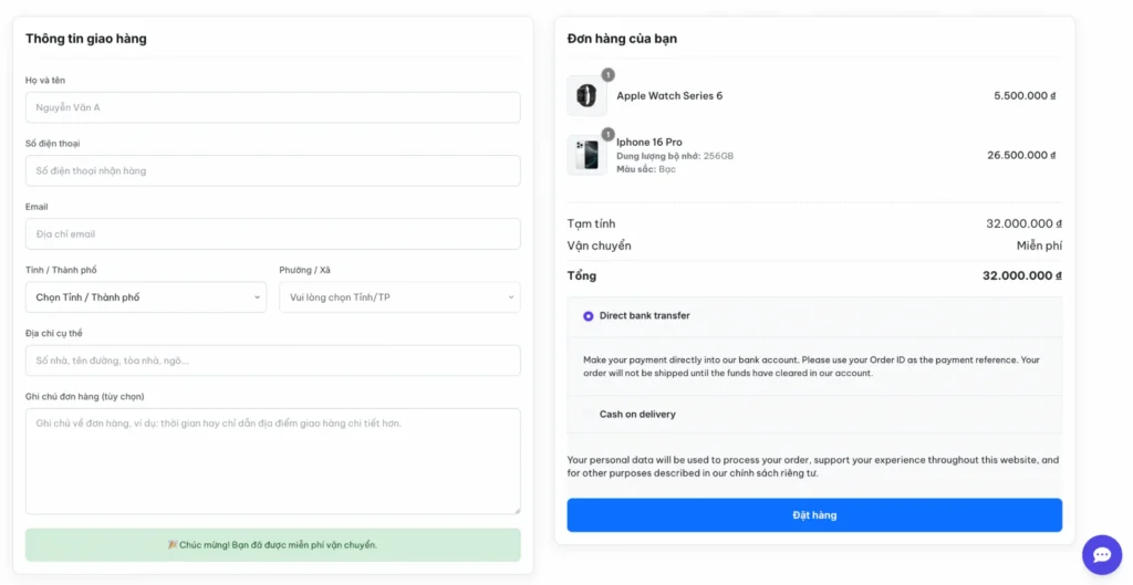 • Thông báo khuyến mãi: Có một dòng thông báo màu xanh lá cây “🎉 Chúc mừng! Bạn đã được miễn phí vận chuyển,” cho thấy hệ thống đã tự động áp dụng ưu đãi cho khách hàng, tạo trải nghiệm mua sắm tích cực.