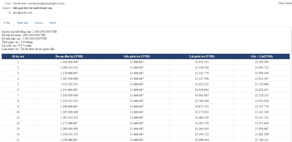 Mail bảng tính chi tiết khoản vay