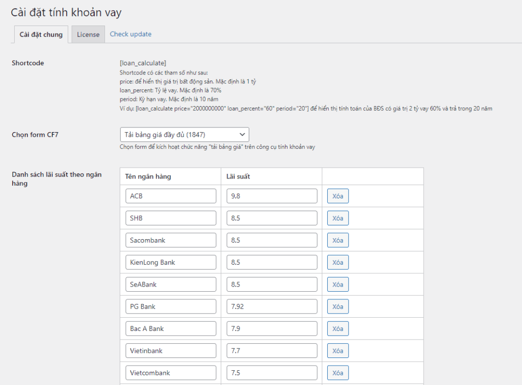 Trong cài đặt bạn có thể chọn Form CF7 và thêm, sửa, xoá các lãi suất của các ngân hàng khác nhau.